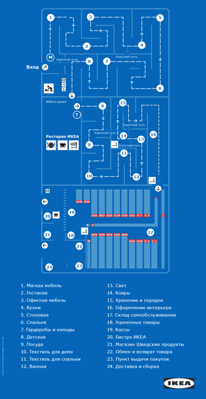 일단, 들어가면 이케아 레스토랑을 볼 수 있고요, 제1섹션에서는(8번까지) 특정한 방의 테마에 맞추어 가구와 가재도구들을 전시해놓은 모습을 볼 수 있습니다. 8번까지의 전시 섹션에서 눈여겨봐뒀던 항목들은 제2섹션, 9번부터의 16번까지의 공간에 진열되어 있고, 진열섹션 다음에는 편의상 제3섹션, 17번의 셀프 가구수령대와 계산대, 포장대, 배송 요청대가 위치한 모습입니다.