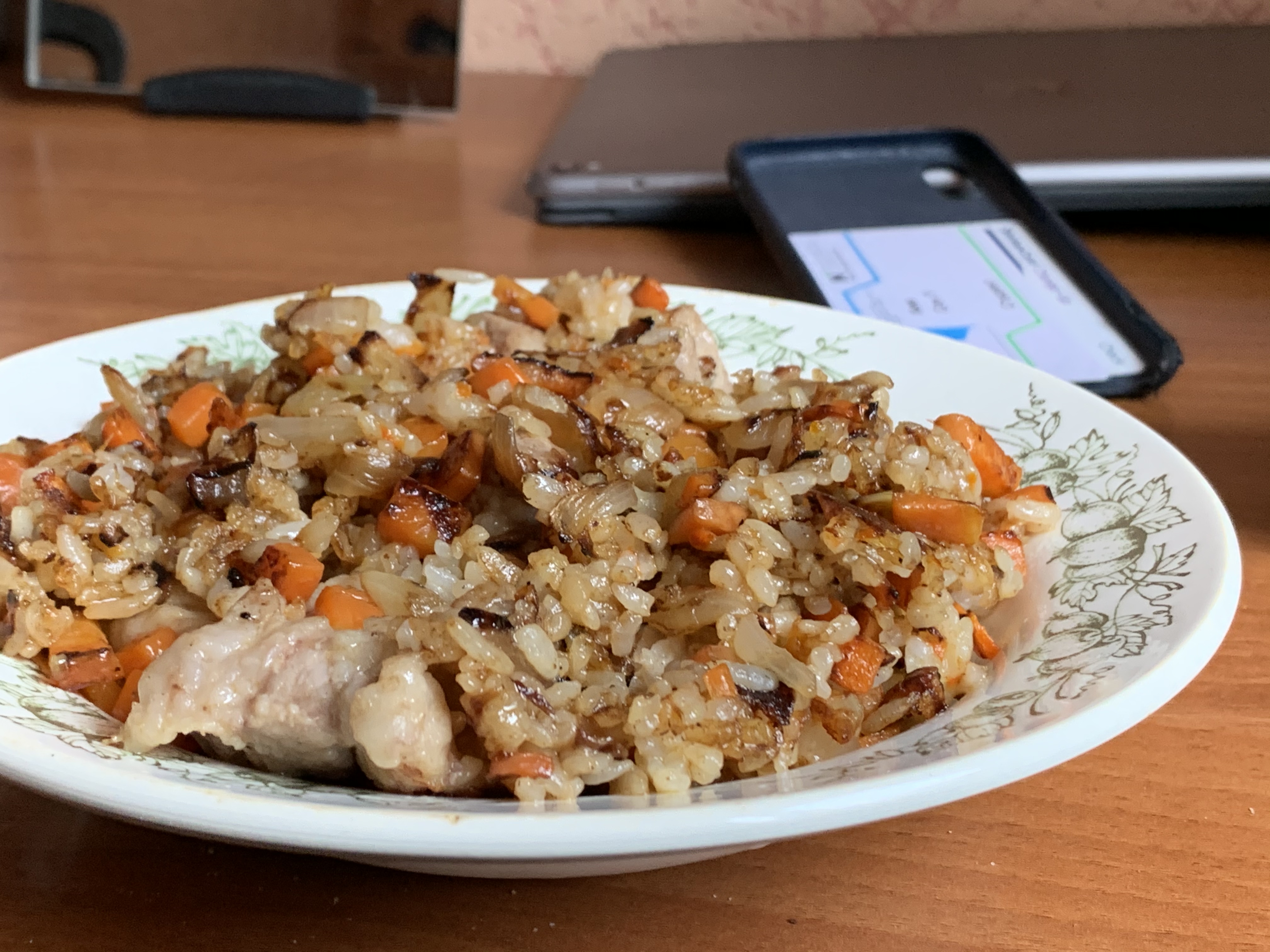 왼쪽은 20루블짜리 빈 쁠롭을 가져와서 당근이랑 양파, 돼지고기까지 넣어서 볶은 거고, 오른쪽은 아마 뒷다리고기가 들어간 쁠롭 (85루블정도)에 계란만 넣어서 볶은 음식입니다. 어떻게 보면 반쯤 패스트푸드라고 볼 수도 있겠네요!
