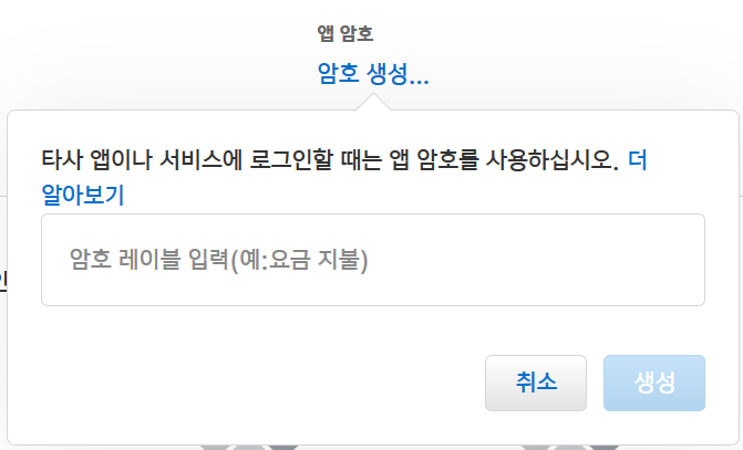 로그인한 뒤 '보안' 탭 - 앱 암호 (암호 생성) 를 눌러줍니다.