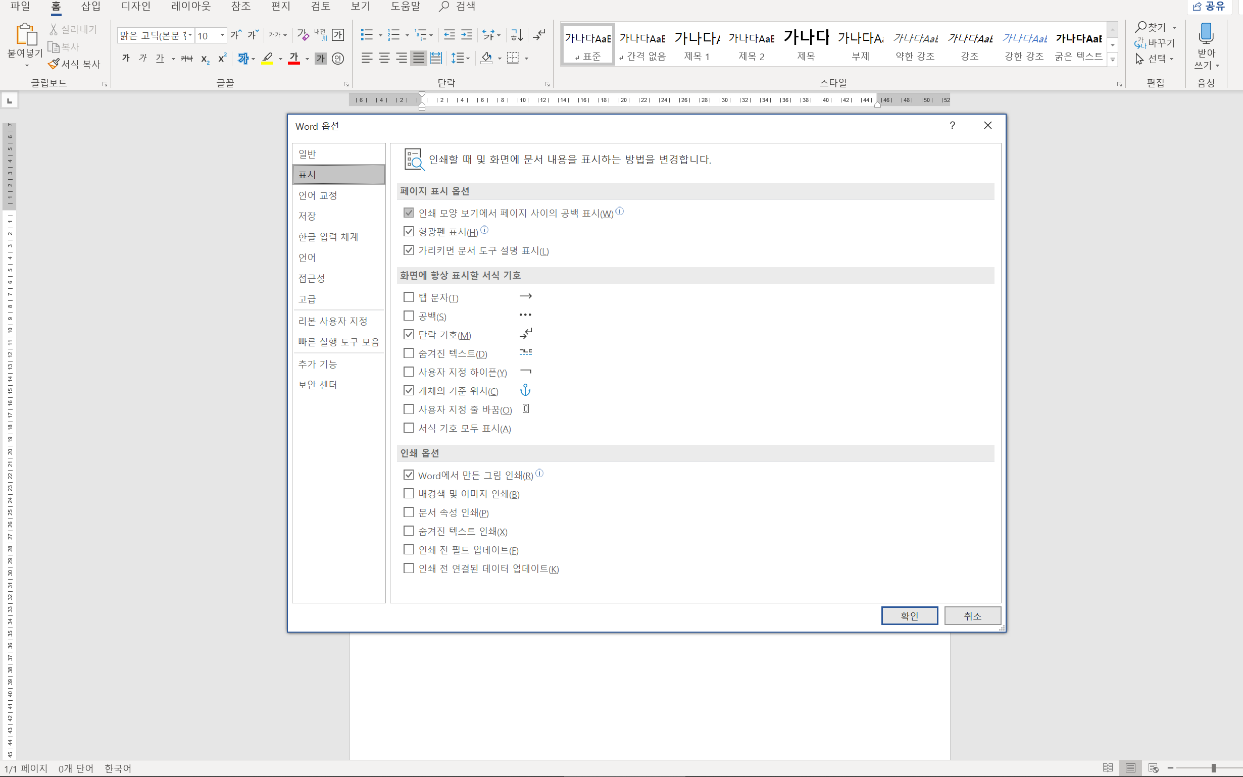 단락 기호, 탭 문자, 공백 등의 표시 여부를 정할 수 있습니다.