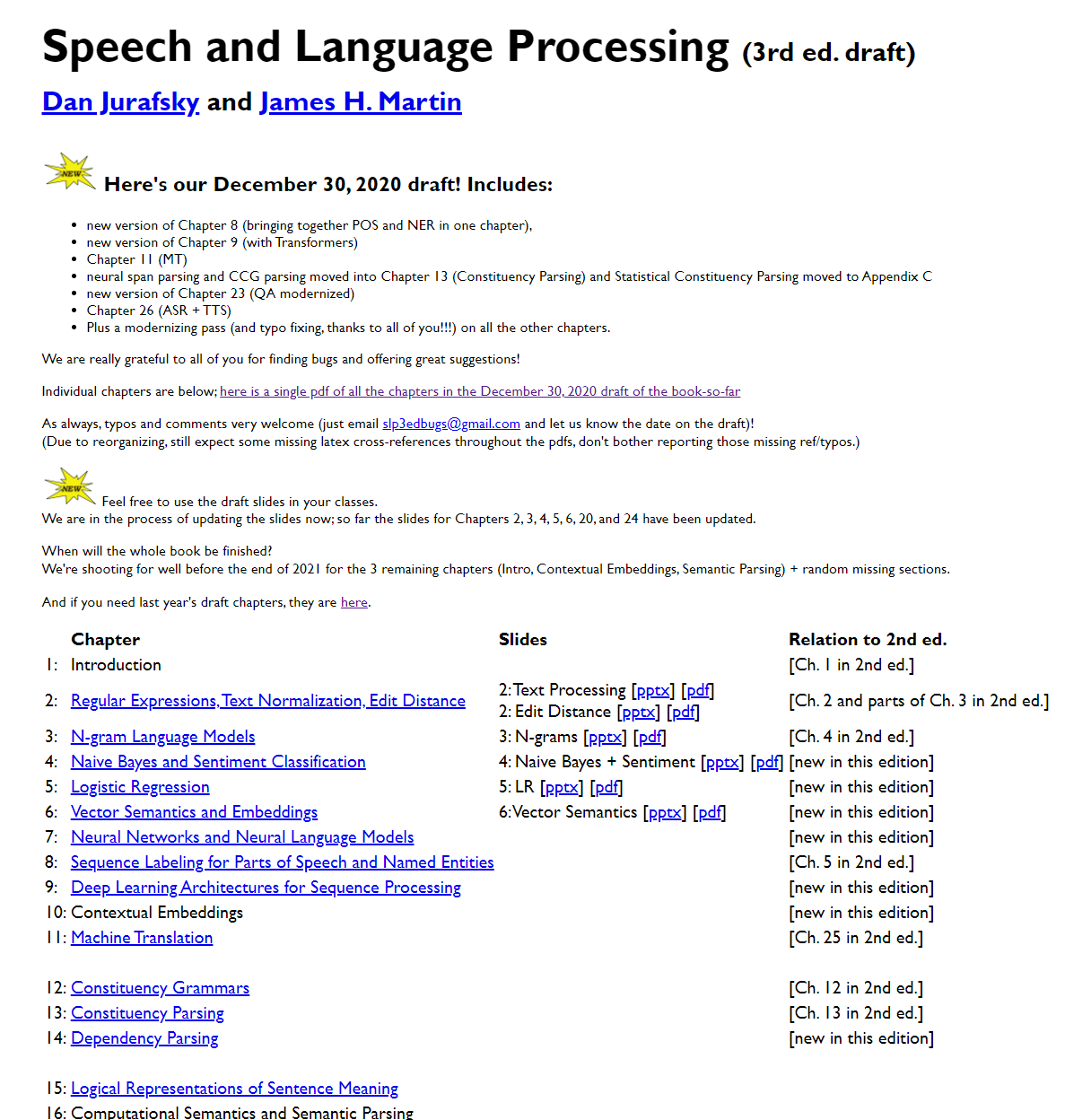 Jurafsky & Martin(개인 페이지가 있다는 사실은 멋지군요)의 공저인 SLP는 NLP 교과서 중 가장 보편적이고 정석적인 교과서 가운데 하나입니다.