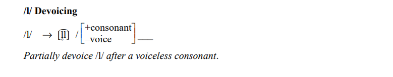 먼저 Devoicing(무성음화)은, 무성자음 뒤에 발음될 때 원래 유성인 l이 무성으로 발음된다는 것입니다. slight에서 s는 무성자음이므로, 후행하는 l은 순간적으로 무성음화되었다가 다시 유성음으로 돌아옵니다.