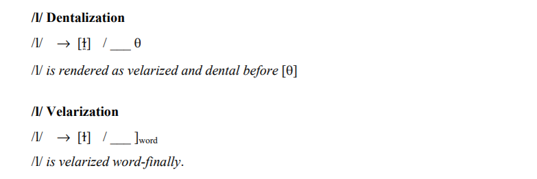 Velatization(연구개음화)은 어말에서 조음위치가 연구개 쪽으로 간다는 변화입니다. 실제로 final, file 등 음운적으로 l이 마지막에 오는 단어들을 발음해보면 목 뒤쪽으로 넘어가는 듯한 느낌이 든다는 것을 알 수 있습니다.