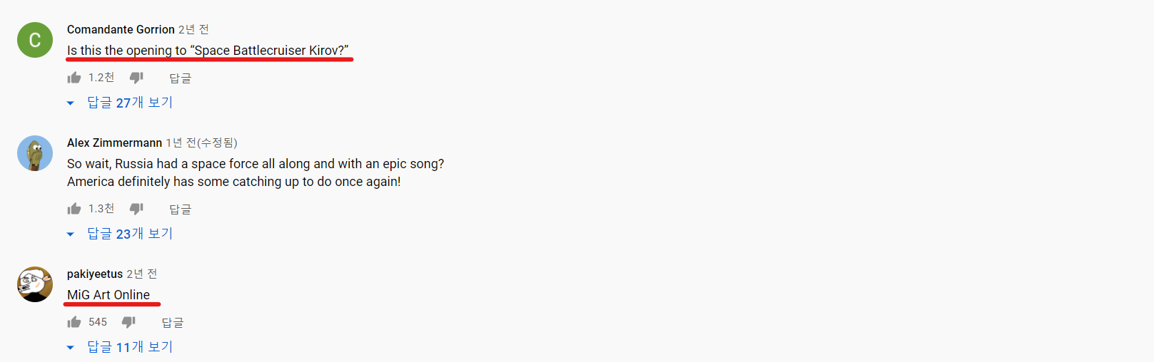 얼마 전부터 우주군(Космические Войска)이라는 노래를 듣게 되었습니다. 애니메이션 주제가같은 명랑한 곡조로 작곡된 탓에 유튜브 영상 댓글에는 “Space Battlecruiser Kirov", "MiG Art Online" 같은 드립이 넘쳐납니다.