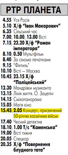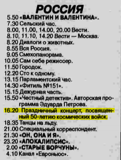 2시간 동안 방송되었지만 인터넷에 남은 영상은 많지 않은 것 같습니다. 앞의 우주군 군가(Космические войска)를 제외하면 제가 찾은 건 딱 2개로, А. Гоман가 부른 달로 가는 티켓Билет на Луну와, (걸)그룹 Территория любви가 부른 비행Полёт입니다.