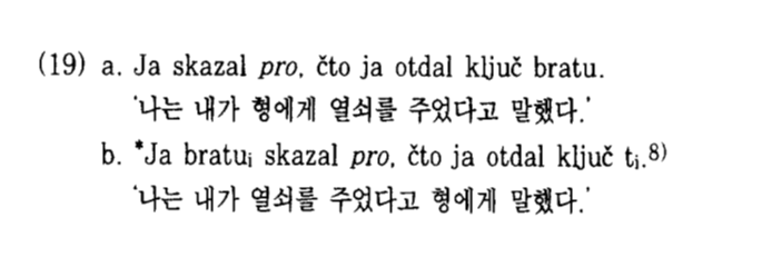 여기서 '형에게'를 앞으로 빼버리면 비문이 됩니다. 이게 왜 이러냐면 про라는 공목적어(null object)는 영어의 which, that처럼 뒤따르는 어구를 결속하는 역할을 하는데, 공목적어의 결속을 무시하고 '형에게'을 앞으로 뺐기 때문에 비문이 된 것이죠. 이것을 보면 어순 뒤섞기가 단순히 언어유희나 강조를 위해 사용될 수도 있겠지만, 어디까지 뒤섞어야 비문이고 어디까지는 성립되는 문장인가, 를 알아봄으로서 학술적인 목적으로, 문법을 탐구하는 데에 사용될 수도 있음을 알 수 있습니다.[2]