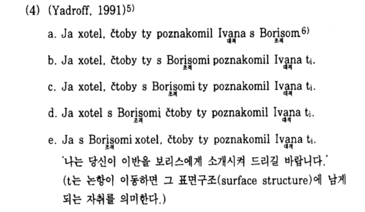 [1] 일반적인 뒤섞기에 관한 내용과 예시문장은 서승현, ‘러시아어 구어체에서의 뒤섞기 (scrambling), 자질의 동질성 그리고 상대적 최소(Relativized Minimality)의 관계’, 한국노어노문학회, 노어노문학 제 15권 2호(2003), p. 63.을 참조하였다. 예문은 Yadroff, M. "The Syntactic Properties of Adiunction." unpublished manuscript. 1991.을 해당 논문에서 재인용한 것이다.