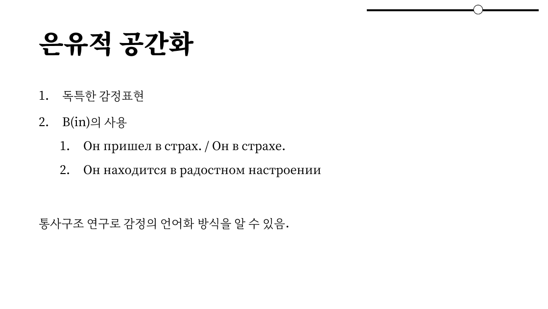그가 공포 안에 있다, 라는 말로 한국어에서는 사용하지 않는 구조죠. 또한 그가 행복한 기분에 위치하고 있다. 라는 문장의 존재로 은유적인 공간화라는 것이 완전히 증명됩니다. 통사적 구조를 연구하여 어떤 방식으로 감정을 언어화하는지도 알아볼 수 있는 것이죠.