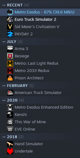 데모 및 무료 게임을 제외해보면 제가 실제로 스팀에서 심도있게 플레이했던 게임은 아래 목록의 15개가 전부라고 생각됩니다. 이중 최근 플레이한 4개 게임과 사실상 같은 게임인 ATS를 제외한 9개 게임을 다뤄보겠습니다.