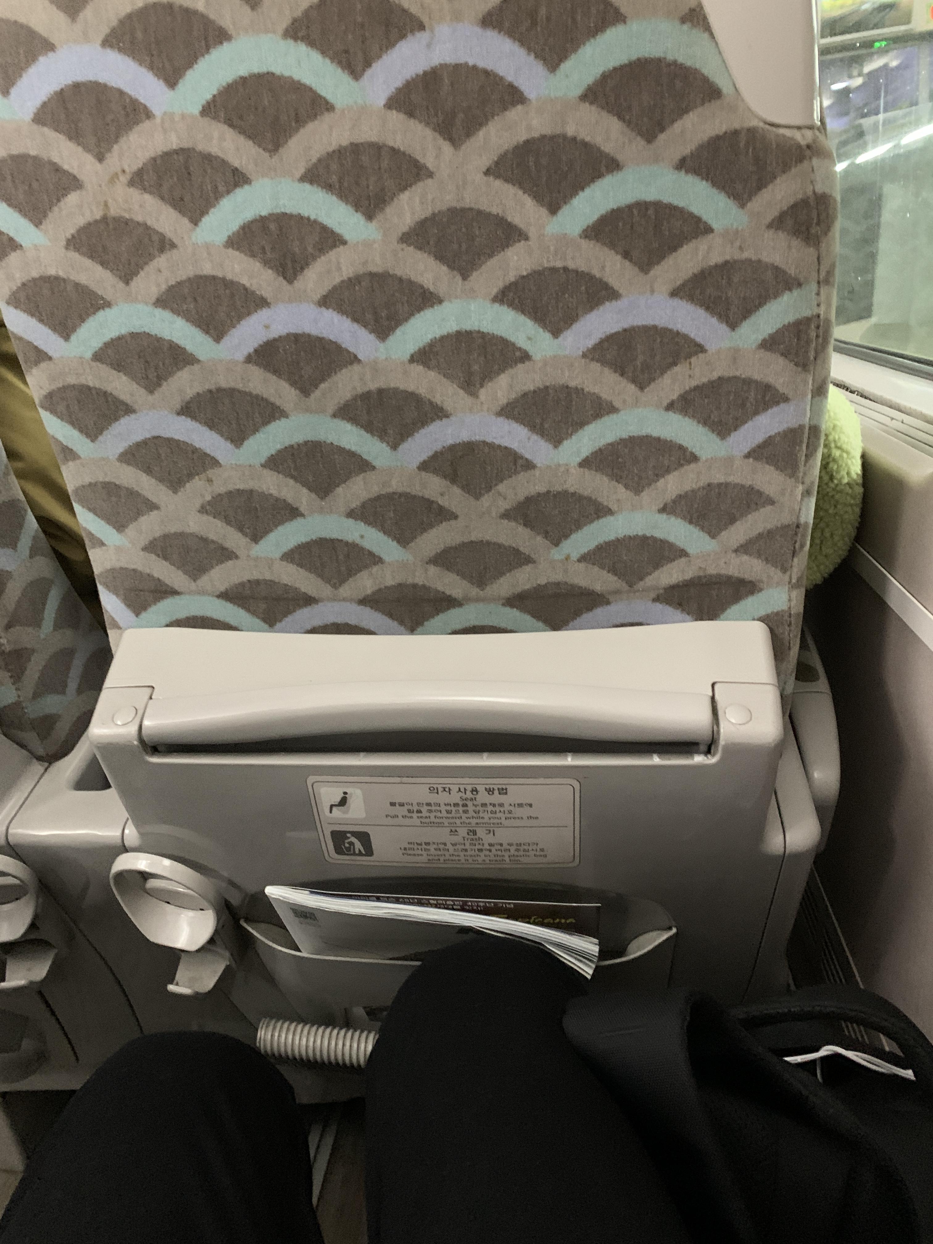 먼저 KTX-산천인데요. 사실 열차는 많이 타봤는데 산천은 처음 타봐서 이것저것 신기했습니다. 산천의 일반실은 KTX 일반실보다 좌석이 훨씬 편안합니다. 좀 더 푹신하고 잘 받쳐줍니다. 아무래도 상대적으로 신형 차량이니까 그럴 수밖에 없겠죠? 레그룸도 조금 더 넓은 느낌입니다.