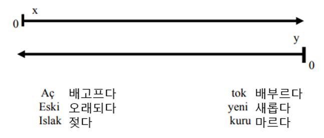 그렇다면 무표 요소인 '새롭다'가 '오래되다'에 비해 2.5배 많이 출현한 것을 어떻게 설명할 것인가? 이 문제에 대한 또 다른 해석이 있다. '새롭다'가 '오래되다'와 하나의 척도에서 존재하는 쌍이 아니라는 것이다. Akşehirli(2014)는 다른 형용사에 비해 오래되다-새롭다, 어리다-나이들다 등 일부 형용사 쌍의 경우 무표성을 나타내는 쌍이 따로 없다고 보았다.6 (Akşehirli 2014, 52) 해당 쌍들은 통상적으로 생각되는 등급성 반의어의 단일 척도 모델과는 다르게 하나의 척도 안에 있는 것이 아니라 '새롭다'의 척도와 '오래되다'의 척도가 이중으로 존재한다는 것이다. 이 모델에 따르면 '새롭다'의 척도가 0이라면 '오래되다'의 척도는 최대치에 달한다. 즉, 무엇이 다른 하나에 대한 유표 요소이거나, 무표 요소라고 볼 수 없게 된다.